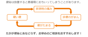 こどもでは、きばる時間が長かったり、腹痛やおしりの痛み、便やおしりに血が付く、などの症状がみられたりすることがあります。日常的にこのような症状がつづくと、こどもはトイレへ行くことを嫌がるようになり、さらに便秘が悪化するという悪循環に入ってしまいます。気になるなぁ…、と思った時点で一度ご相談いただくことをおすすめします。